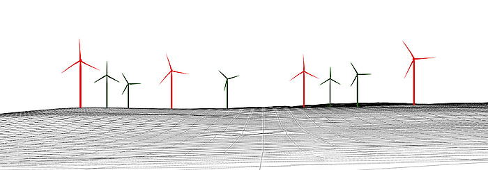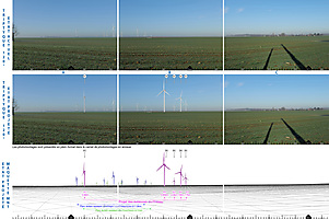 A partir des données de l’IGN et des caractéristiques des éoliennes, une maquette 3D est réalisée. Celui-ci inclue le Modèle Numérique du Terrain (MNT), les éoliennes en 3d dimensions et certains éléments remarquable qui serviront à calibrer les caméras. Le contexte éolien est également modélisé (parcs existants, autorisés et en projet). De cette maquette, le profil est extrait pour accompagner les planches de synthèse.