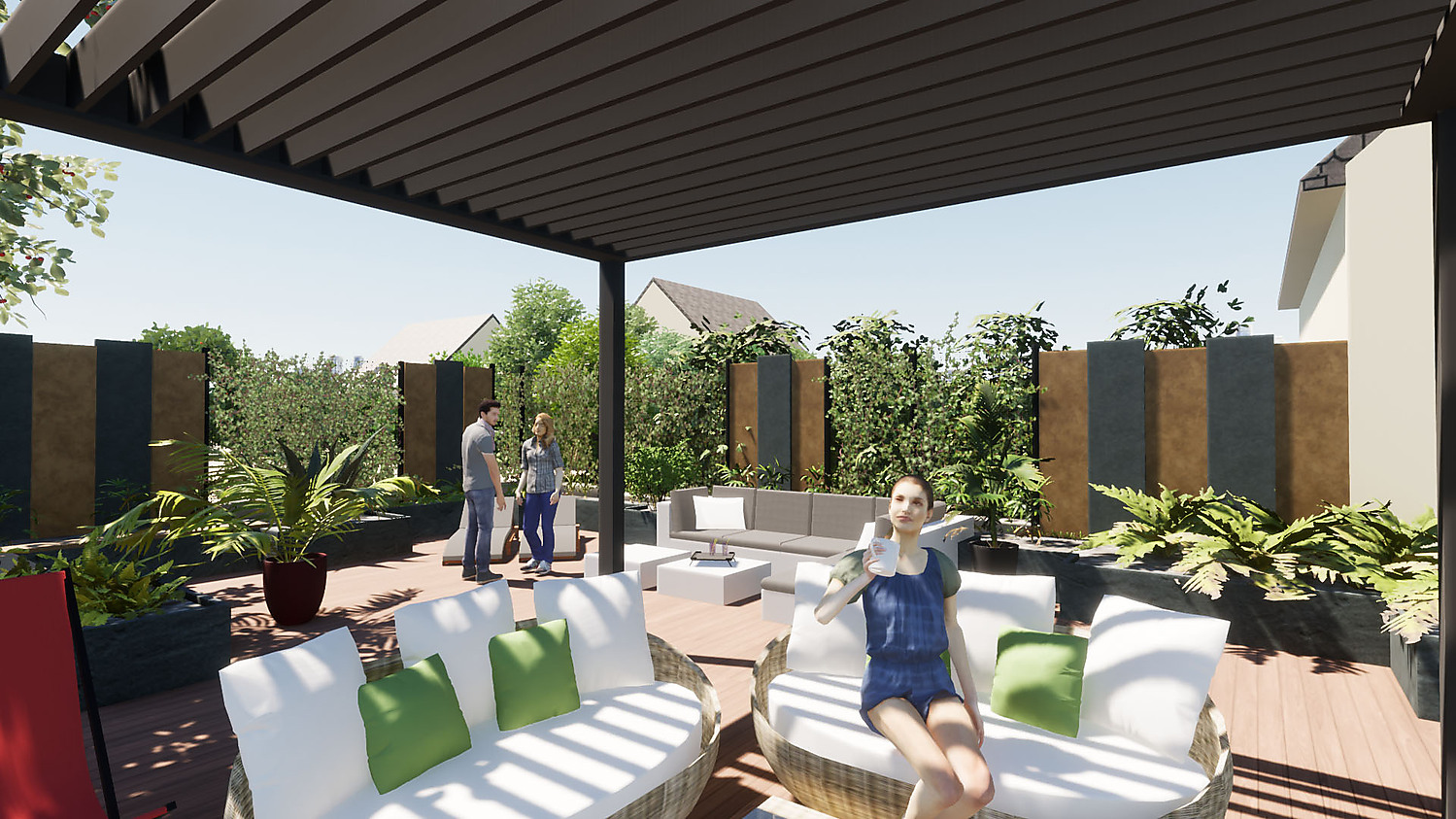 Les bâtiments existants et le jardin projeté sont modélisés en 3 dimensions de manière réaliste. Cette maquette 3D est présentée en réalité virtuelle, en vidéo ou par des images de synthèses photoréalistes pour s’approprier le projet le plus fidèlement possible.
